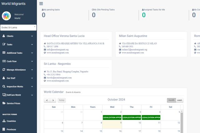 Purpose: This system was developed to manage Mondo Migranti's entire operational process across its branches in Italy and Sri Lanka. It streamlines employee management, task workflows, customer registration, and financial updates